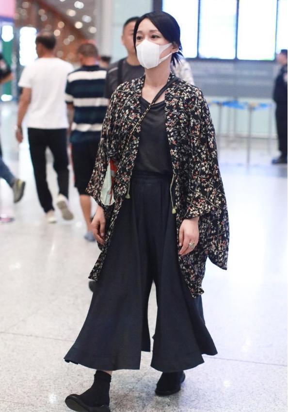 外套搭配像”大妈“但是内搭却十分的惊人,外套上带有很多小碎花也是一直褪不去的经典。周迅整体以黑色为主,不仅可以显瘦而且气场满满。随意扎起的头发很低调,一身黑现身机场自带一种神秘的感觉